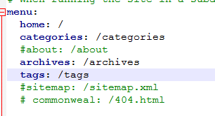 home是主页,categories是分类,archives是归档,即按时间显示文章,tags是标签,将以上几项的#取消。