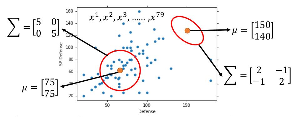 我们可以看到 $\Sigma , \mu$ 取不同的值,假如一个圆圈代表一个高斯分布,每个点的概率将会不同,而我们的目的是让所有点的尽量符合当前模型。此时,我们可以用一个 likelihood ( 似然函数 ) 来衡量。