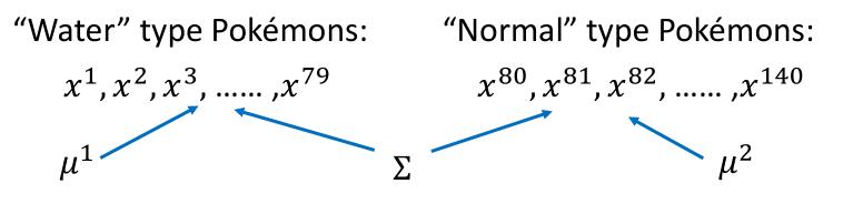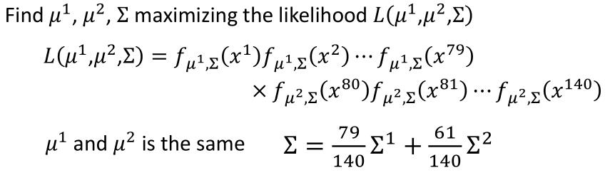 之前我们有四个参数,$\mu ^1 , \Sigma ^1 , \mu ^2 , \Sigma ^2$ ,我们可不可以把 $\Sigma ^1 , \Sigma ^2 $变为一个,变为 $\mu ^1 , \Sigma , \mu ^2 $ 三个参数,简化我们的模型。