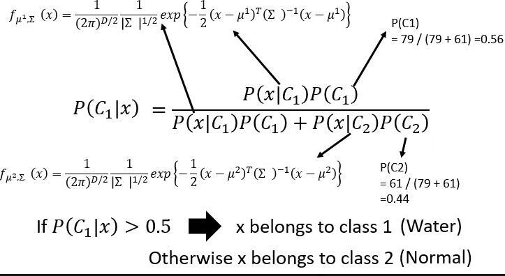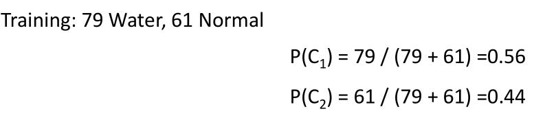 观察到公式 P(C1) 和 P(C2) 非常好算,无非是用属于 Class1(Water) 的个体数量处除以总数就是 P(C1),用属于 Class2(Normal) 的个体数量处除以总数就是 P(C2)。如下图: