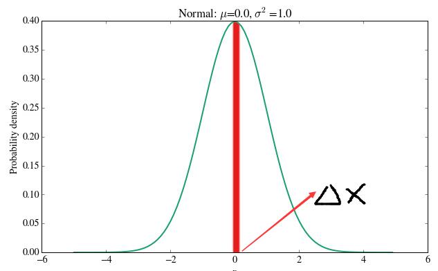 那么变量等于 0 的概率密度是 0.4 ,那它的概率是多少呢?理论上某个点的概率应该是 0 ,但我们可以求 (0 , 0 + △x) 的概率,那么 (0 , 0 + △x) 的概率可以近似于红色矩形的面积,所以 (0. , 0. + △x) 的概率就是 0.4△x。假如 △x 很小,那么我们就可以近似的把 0 处的概率当做 0.4△x 。