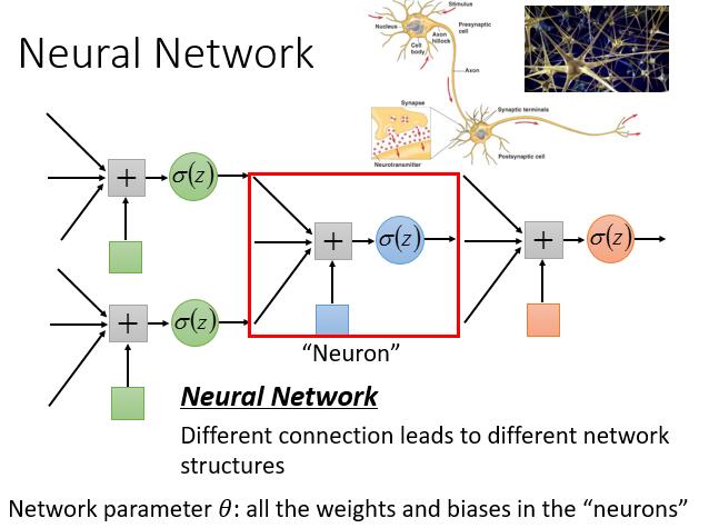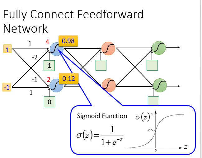 深度学习的 Model 不像之前可以有一个固定的式子,它中间的神经元可以随便连接,不同的连接就是一个新的 Model 。可以尝试不同的连接,从而找一个可以满足自己预期的模型。最常见的有下边一种Fully Connect Feedforward Network (前馈全连接神经网络) 。